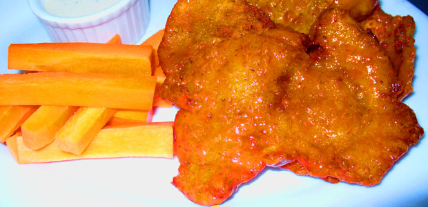 Breaded and seasoned boneless chicken breast, marinated in our own special mild, medium or hot sauce. Deep fried and served with carrots and blue cheese.